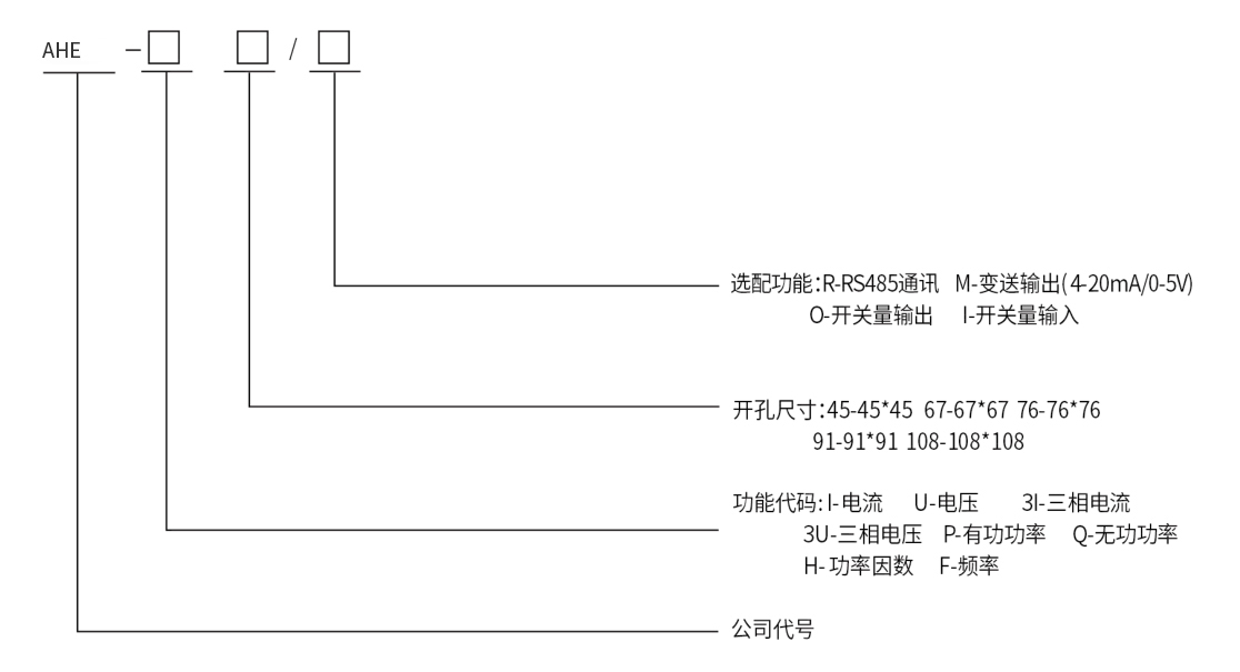 AHE系列智能電力儀表輸入及測(cè)量電量參數(shù)范圍包括:直流電壓、直流電流、交流單相電壓、單相電流、三相電壓、三相 電流、單相有功功率、單相無(wú)功功率、三相有功功率、三相無(wú)功功率、單相有功電能、單相無(wú)功電能、三相有功電能、三相無(wú)功電 能、功率因數(shù)(COScp )、工頻頻率等。可選配RS485通訊接口輸出(采用Modbus-RTU協(xié)議),模擬量變送輸出(如4-20mA )功能。
